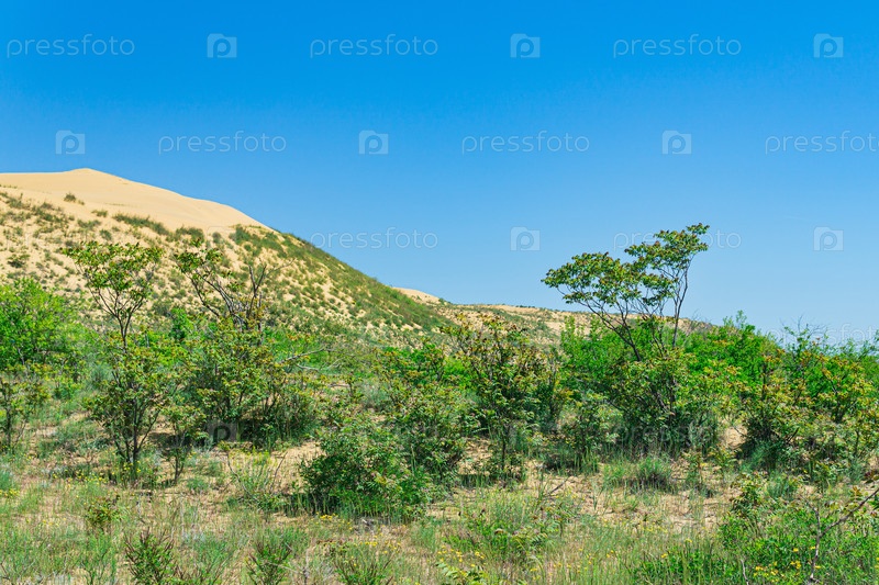 Весенняя пустыня, цветущая растительность на краю песчаной дюны Сарыкум