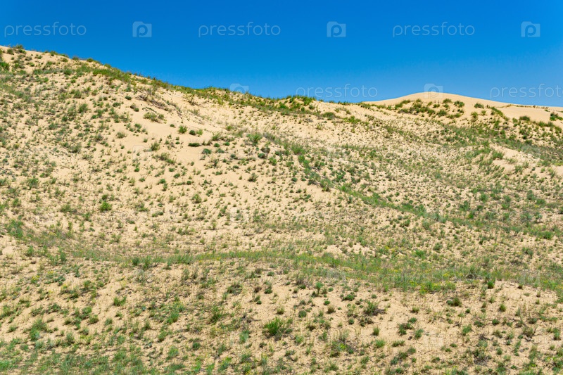 Склон песчаной дюны с цветущими весной растениями, дюна Сарыкум в Дагестане