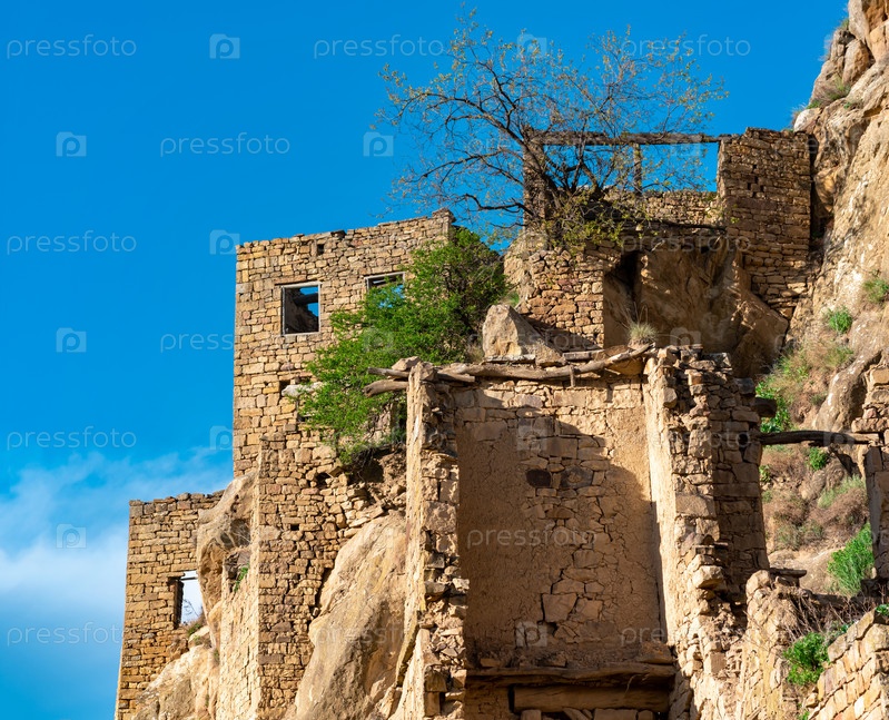 Руины каменных домов, прикрепленных к скале в безлюдном селе Гамсутль в Дагестане