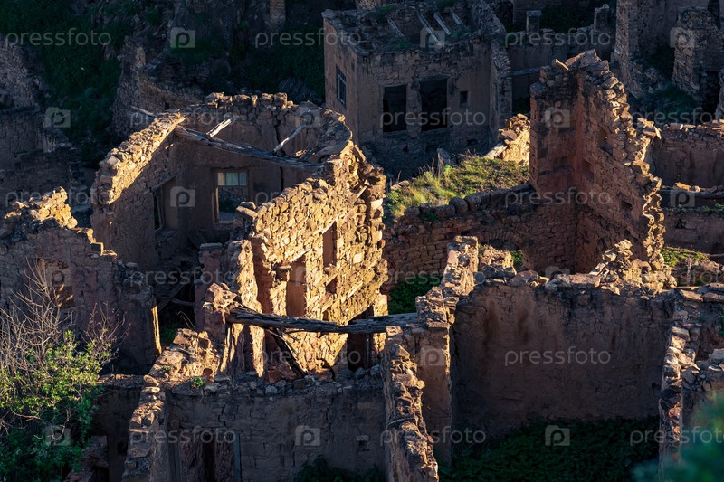 Вид сверху на руины построек нежилого села Гамсутль в Дагестане