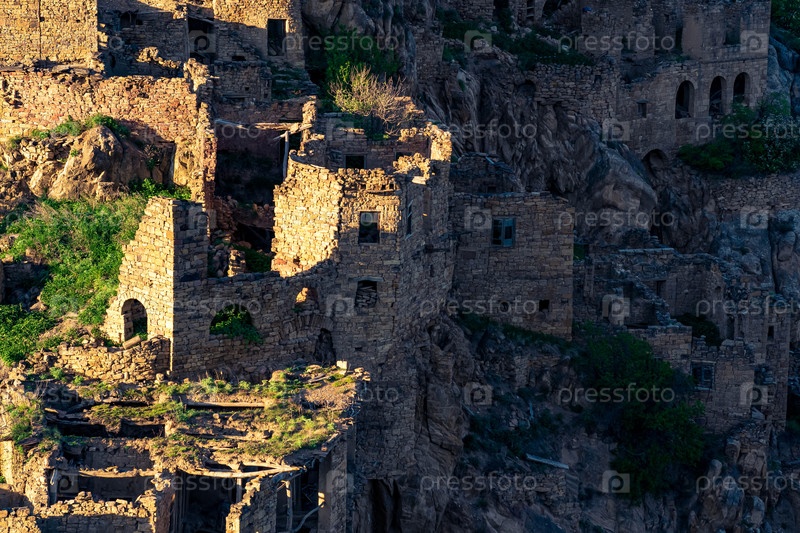 Вечерний вид на руины деревни-призрака Гамсутль, освещенные последними лучами солнца