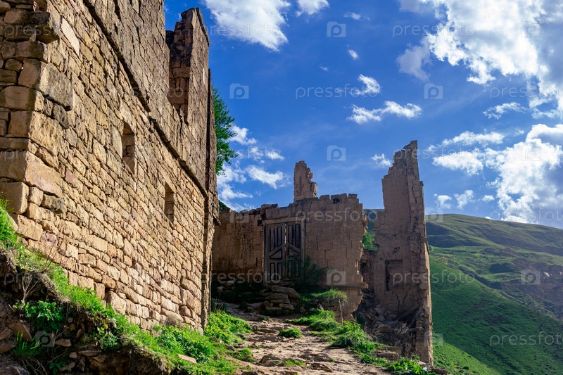 Остатки домов в заброшенной деревне Гамсутль с видом на горы