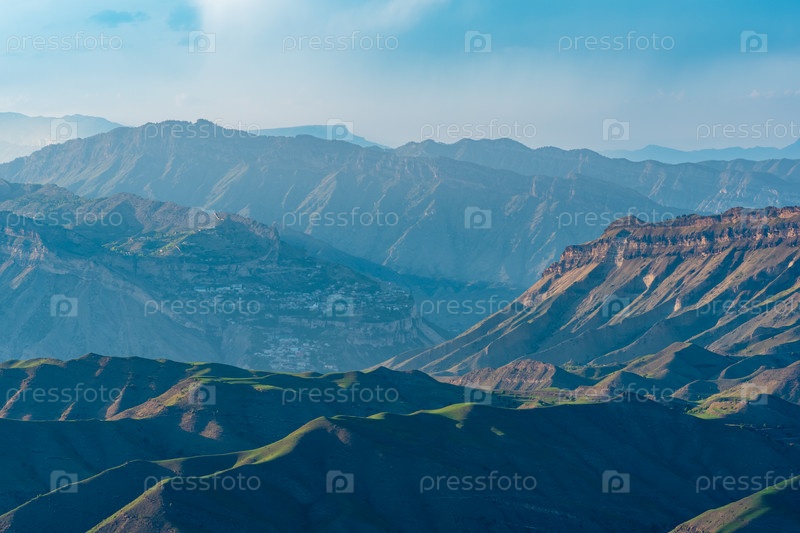 Мягкий размытый природный ландшафт с гористой местностью, село Гуниб, Дагестан, видно вдалеке в дымке
