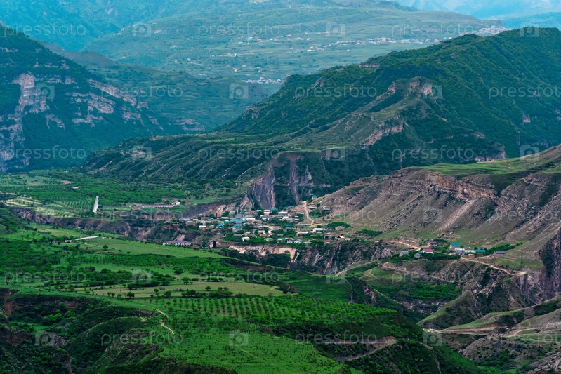 Вид с воздуха на деревню в горной долине среди садов и полей