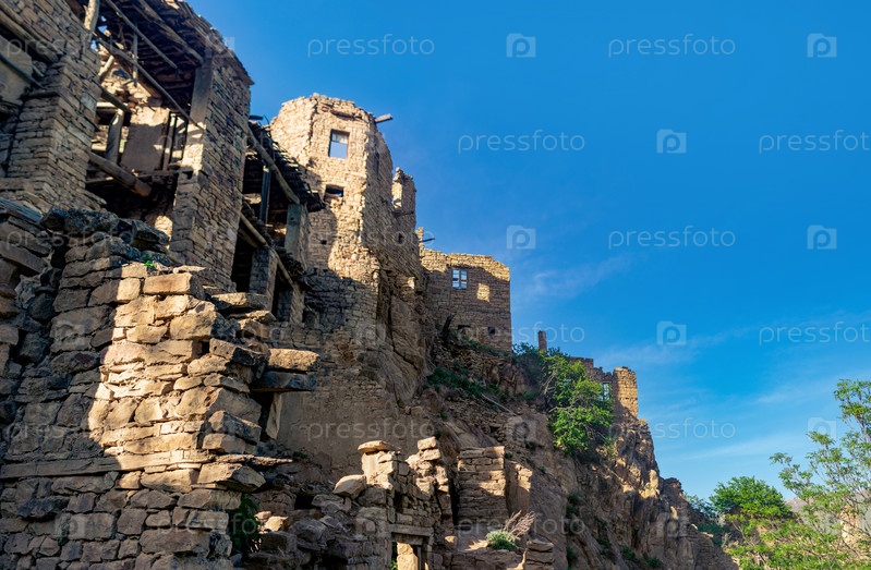 Разрушенные старые высокие каменные дома в заброшенном селе Гамсутль, Дагестан