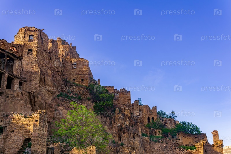 Руины домов на скале в заброшенном селе Гамсутль, Дагестан