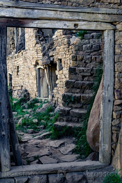 Ворота в старой заброшенной деревне Гамсутль, сквозь которые видна улица с руинами домов