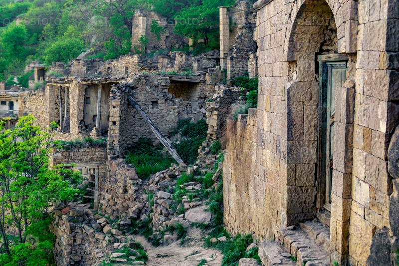 Руины домов на склоне горы в пустом селе Гамсутль, Дагестан