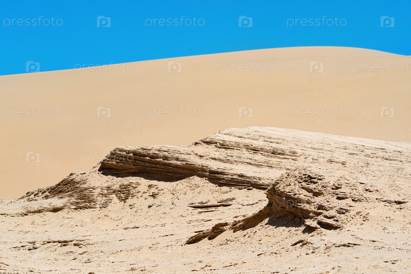 Литифицированные песчаные отложения на фоне песчаной дюны в пустыне