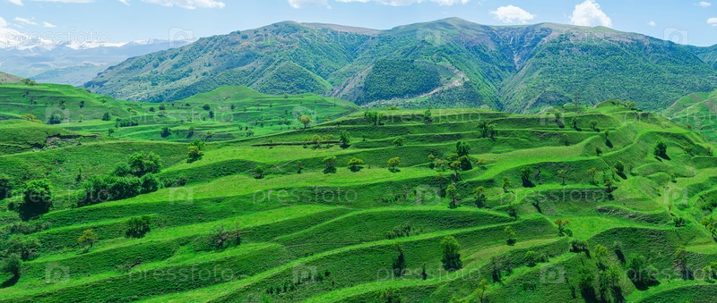 Горный пейзаж с зелеными сельскохозяйственными террасами на склонах