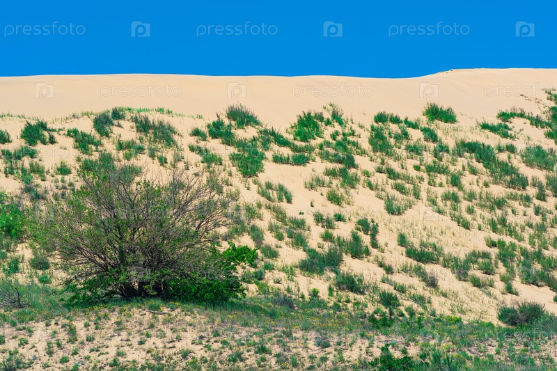 Склон песчаной дюны с цветущими весной растениями, дюна Сарыкум в Дагестане