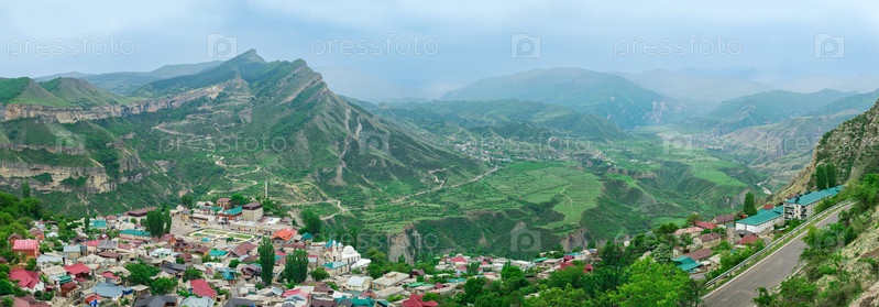 Вид на село Гуниб на склоне горы и туманную горную долину за ним, пейзаж Северного Кавказа