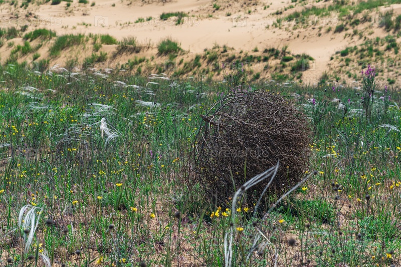 Перекати-поле катится по сухой ковыльной степи
