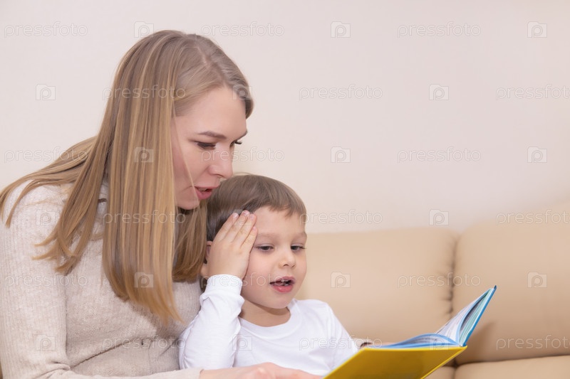 Женщина читает книгу ребенку в помещении