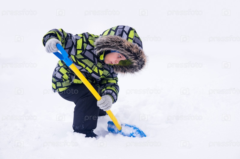 Маленький мальчик играет зимой в снегу