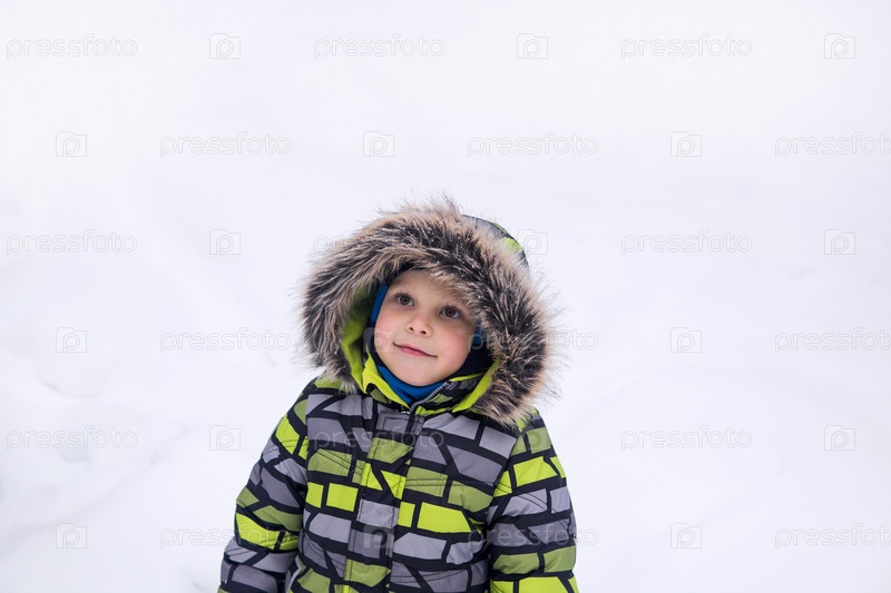 Улыбающийся ребенок гуляет снежной зимой