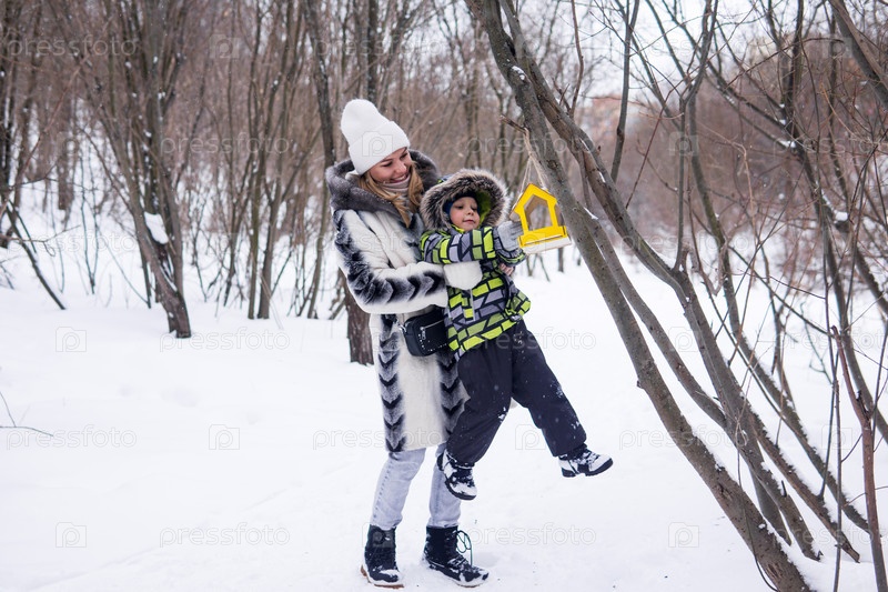 Мать и сын в зимнем парке кормят птиц с помощью кормушки