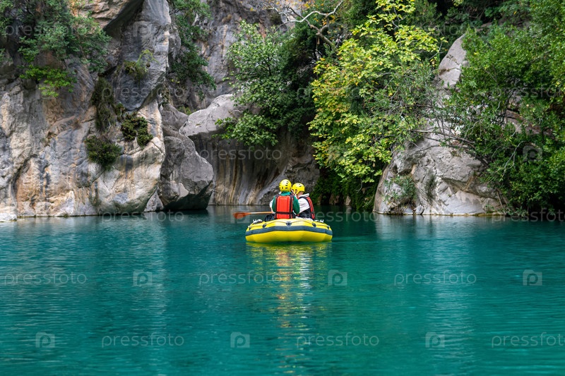 Туристы на надувной лодке сплавляются по каньону с голубой водой в Гейнюке, Турция