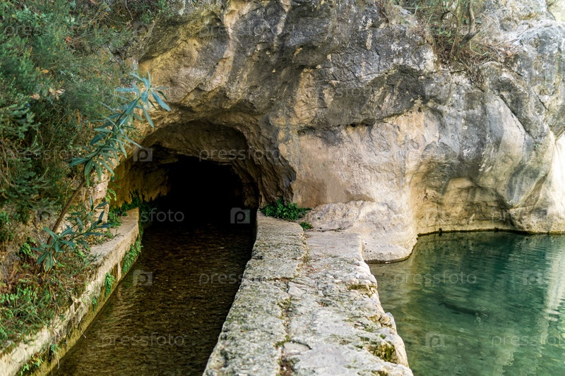 Бетонный искусственный ручей под скалой в горной местности