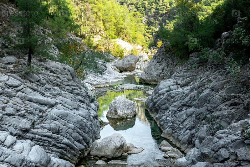 Горный пейзаж с рекой со скалистым руслом