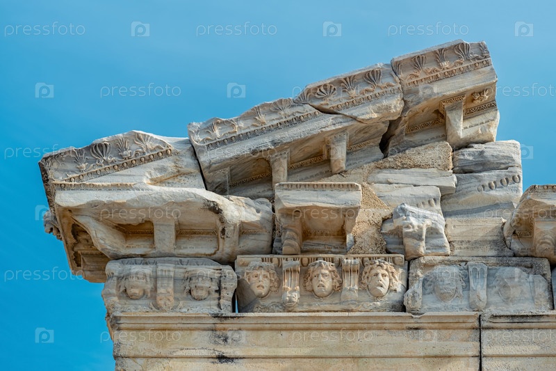 Фрагмент колоннады разрушенного храма Аполлона в Сиде с каменным рельефом на фризе