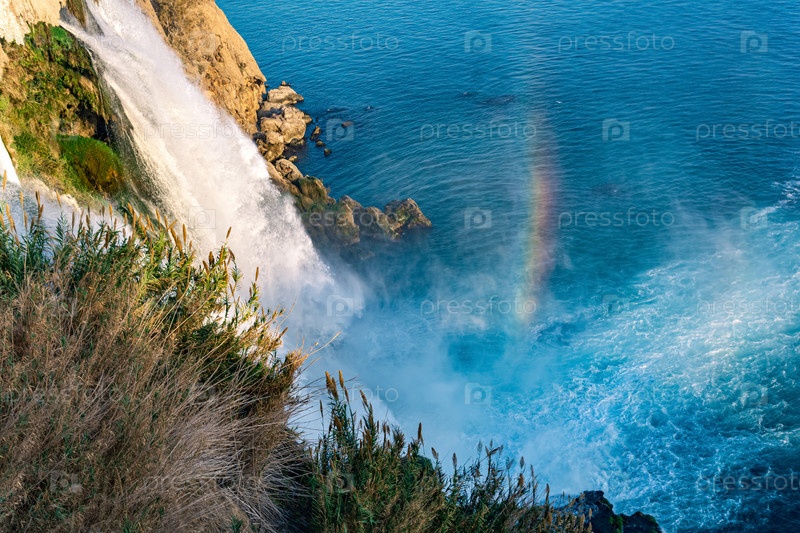 Радуга у подножия водопада, падающего в море со скалы, Нижний Дюден, Анталья