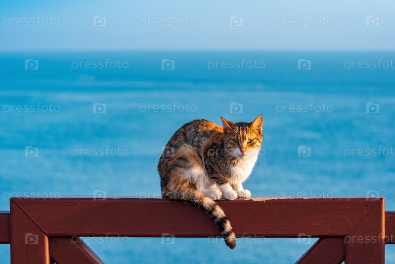 Кот сидит на заборе на фоне моря