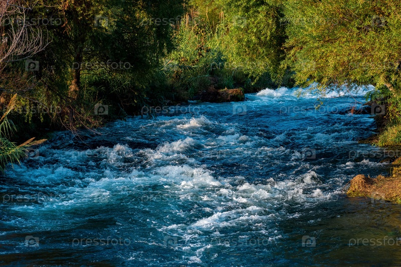 Быстрая горная река течет среди лесистых берегов