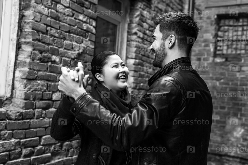 Молодая пара танцует в старом переулке, монохромная