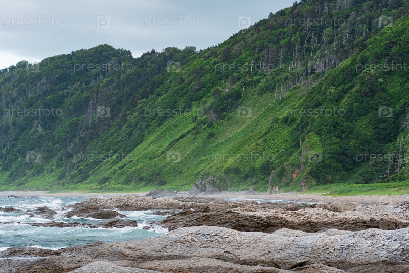 Прибрежный пейзаж, красивые лесистые скалы на зеленом побережье острова Кунашир
