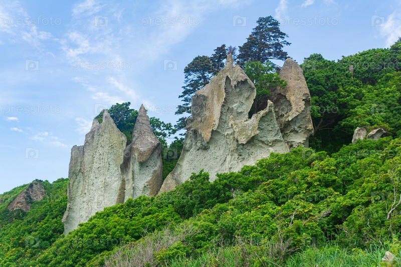 Прибрежный пейзаж, красивые лавовые скалы на зеленом побережье острова Кунашир