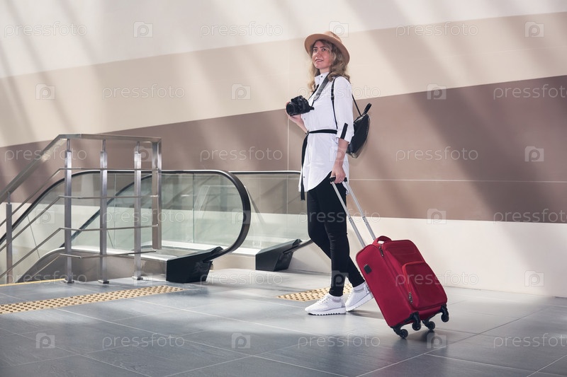 Женщина-путешественница с чемоданом перед эскалатором в аэропорту или на вокзале готовится выйти в город