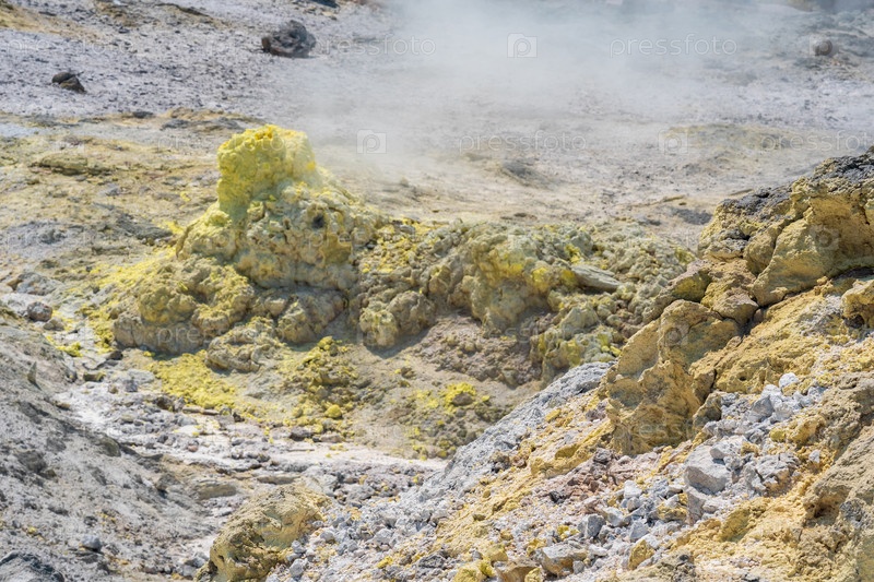 Залежи серы вокруг сольфатары в фумарольном поле на склоне вулкана