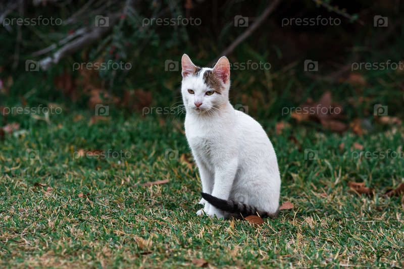 Бездомный котенок возле своего приюта в кустах парка