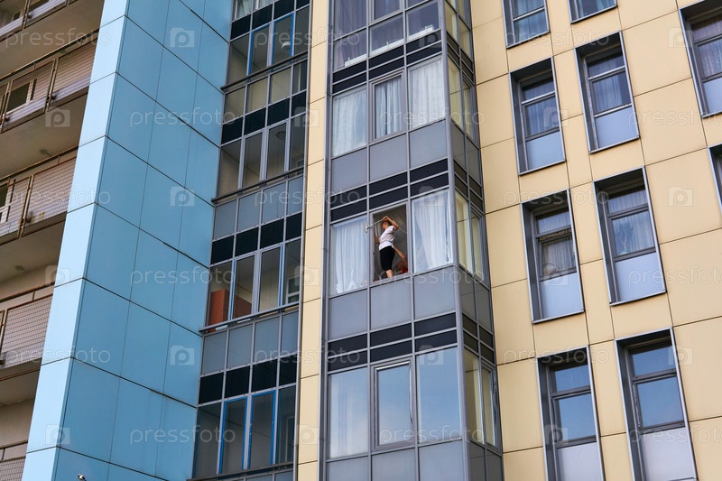 Жители моют окна в многоэтажном жилом доме