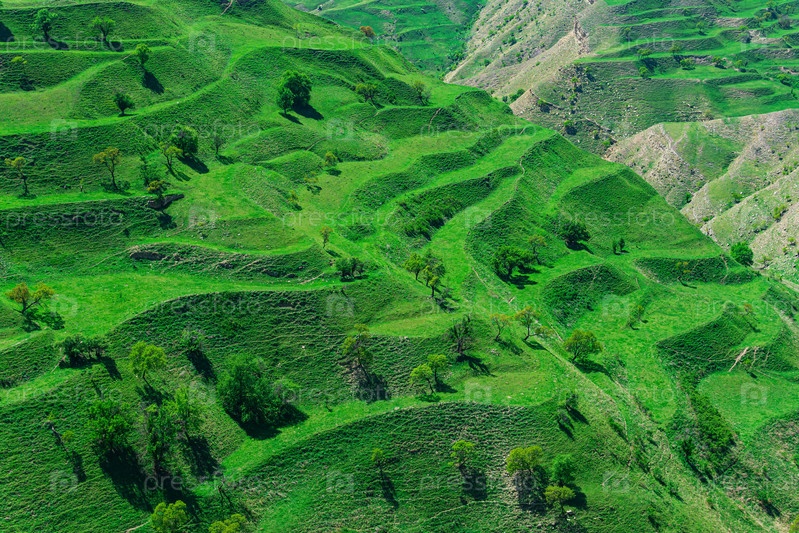 Горный пейзаж с зелеными сельскохозяйственными террасами на склонах