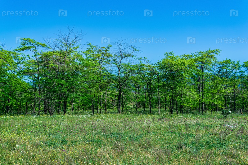 Весенний солнечный открытый лесной пейзаж с цветущим лугом и лиственными рощами