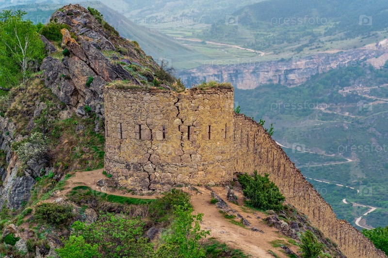 Древняя башня и стена замка на вершине отвесной скалы в горной местности, крепость Шамиля (Гуниба) в Дагестане,