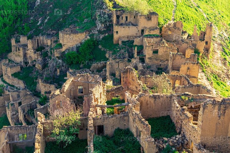 Вид сверху на руины построек нежилого села Гамсутль в Дагестане