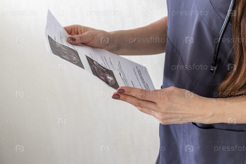 Снимок женщины-врача в форме на фоне белой стены, изучающей ультразвуковое изображение. Здравоохранение