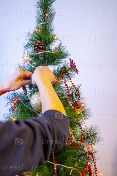 Крупный план женщины, украшающей рождественскую елку. Праздничный день