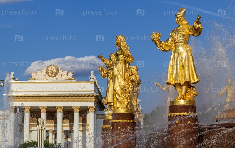 Москва, Россия - 07.09.2023 - Снимок знаменитого фонтана на площадке Выставки достижений народного хозяйства, известной как ВДНХ. Ориентир