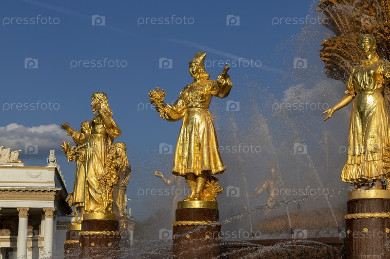 Москва, Россия - 07.09.2023 - Снимок знаменитого фонтана на площадке Выставки достижений народного хозяйства, известной как ВДНХ. Ориентир