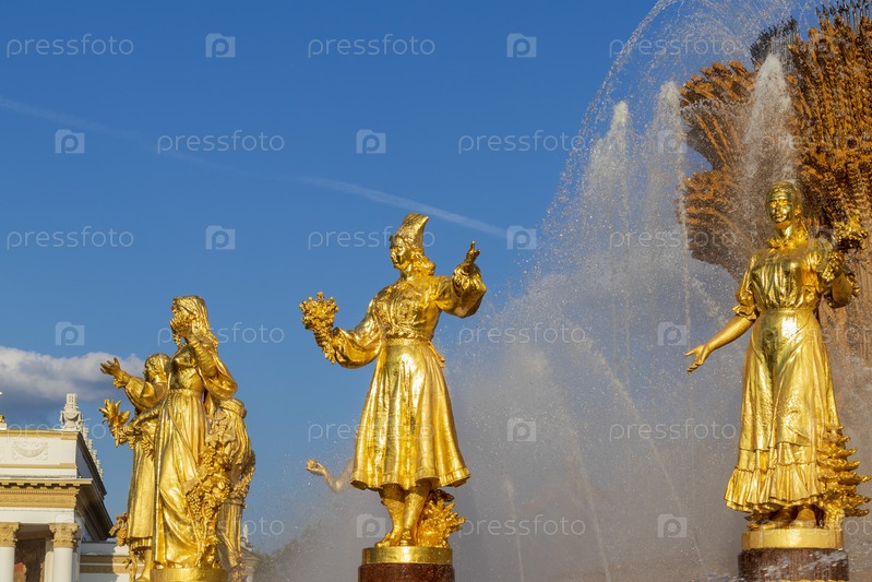 Москва, Россия - 07.09.2023 - Снимок знаменитого фонтана на площадке Выставки достижений народного хозяйства, известной как ВДНХ. Ориентир