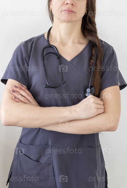 Снимок женщины-врача в форме на фоне белой стены. Здравоохранение
