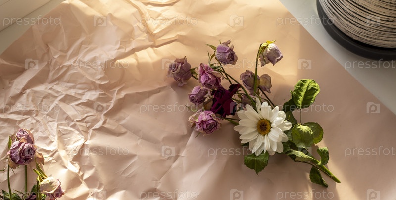 Концептуальный снимок фоновой темы, оберточной бумаги, сушеных роз, других цветов и других композиций. Украшение