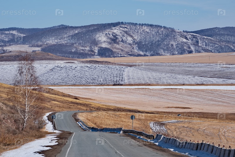 Россия. Красноярский край. Утренний вид на рельефные холмы со скудной растительностью припорошенные последним весенним снегом