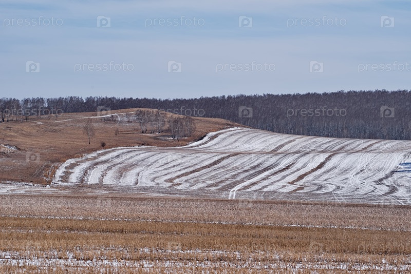 Россия. Красноярский край. Утренний вид на рельефные холмы со скудной растительностью припорошенные последним весенним снегом