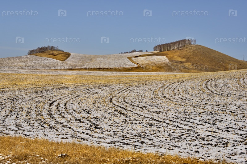 Россия. Красноярский край. Утренний вид на рельефные холмы со скудной растительностью припорошенные последним весенним снегом