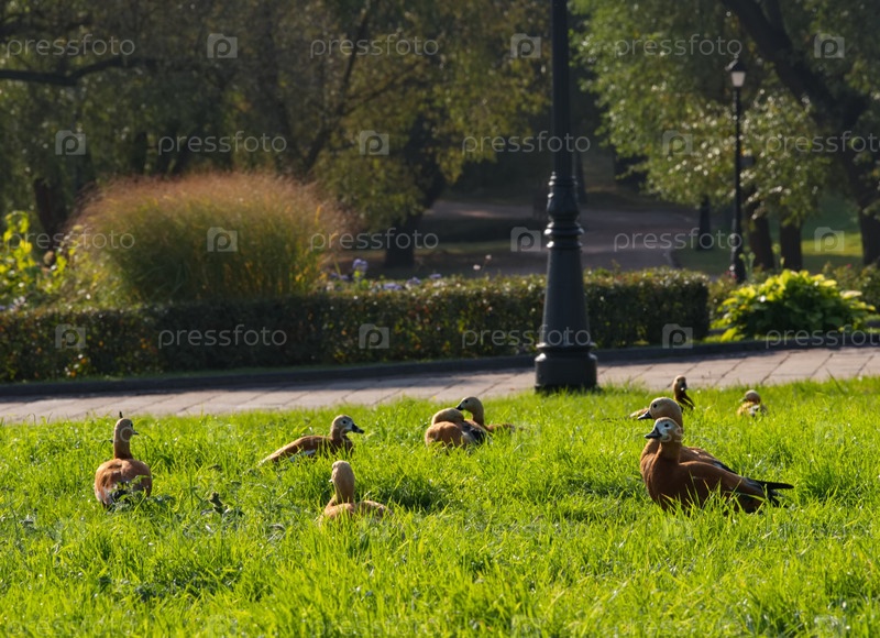 Россия, Москва. Небольшая стайка красных уток (огарь) безмятежно отдыхает в городском парке Царицыно